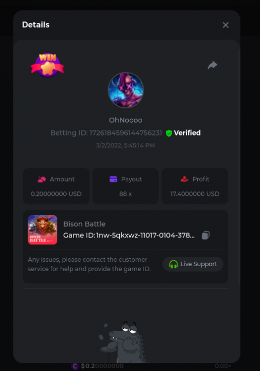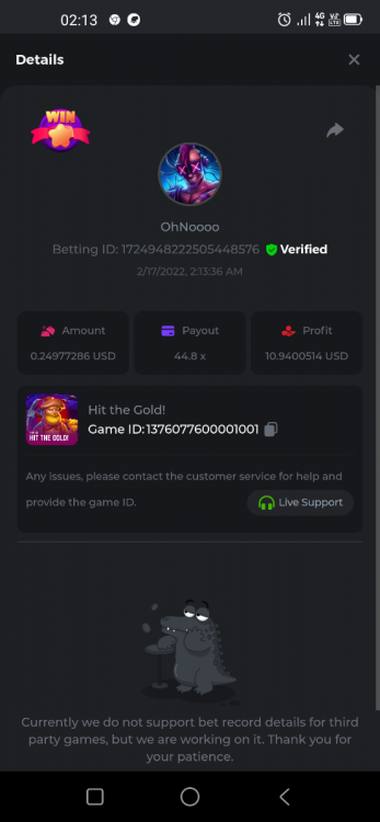 22. Golden Dancing Lion x 177.2 Betting ID: 1724947781266571904 Hit the Gold! x 44.8 Betting ID: 1724948222505448576 Tiger Jungle x 93 Betting ID: 1725143498319811079 Solar Queen x 47 Betting ID: 1725006049288958592